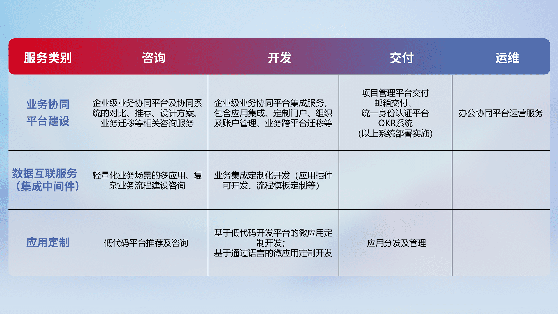 针对钉钉、、企微、、IDaas等平台级产品提供产品的规划、、、、方案、、交付、、、定制化开发等服务,,,,实现如统一协同办公、、、、智能客户服务、、、混合会议管理、、、、智能数据查询、、、等业务场景,,,,实现数字化转型。。